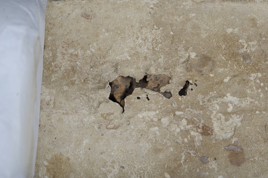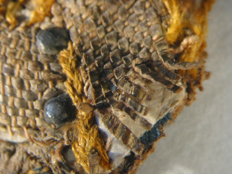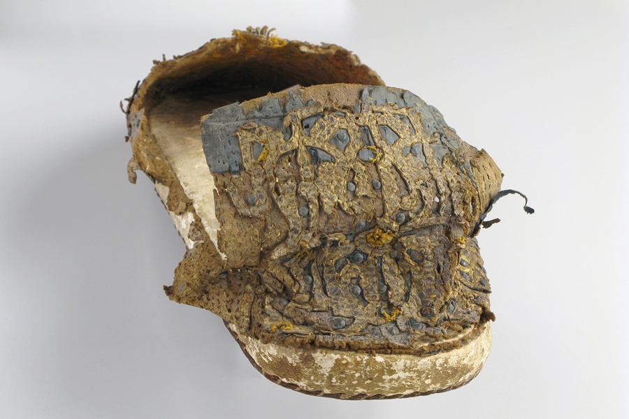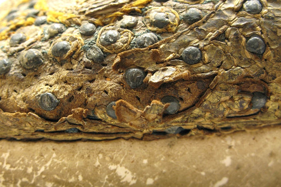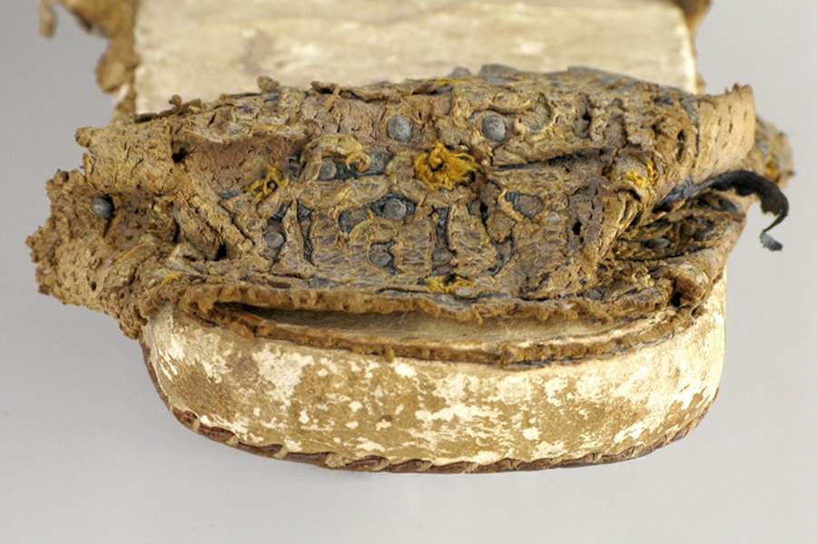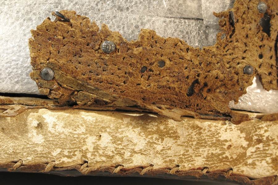 La fragilità dei materiali costitutivi di natura organica è particolarmente evidente nel caso dei filati utilizzati per le cuciture, che sul recto della tomaia sono assai più consunti e scoloriti che non all’interno. Anche la superficie delle teste dei rivetti risulta essere fortemente degradata e caratterizzata da una corrosione che ha prodotto una colorazione nera e opaca. Questa è particolarmente scura nelle zone perimetrali ove è ancora presente la foglia d’argento, mentre su quelle centrali, dove l’argentatura è lacunosa e la lega di stagno direttamente visibile, la superficie presenta un colore grigio più chiaro e una struttura dei grani cristallini più evidente.