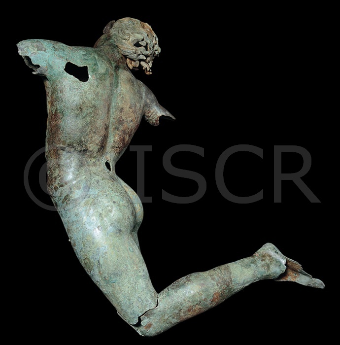 Il demone è colto in un momento della danza orgiastica, nell’atto di compiere un salto sulla punta del piede destro, con la gamba sinistra sollevata, il busto ruotato e le braccia distese. La testa è abbandonata all’indietro fin quasi a toccare le spalle; i capelli fluttuano al vento segnando la forte tensione del Satiro. Sul braccio sinistro era probabilmente avvolta la pelle di pantera, mentre dalla mano pendeva la coppa di vino vuota. La mano destra scuoteva il tirso, tipico attributo della cerchia dionisiaca. La bocca è carnosa, il naso grande, le palpebre spesse con ampi cuscinetti intorno ai globi, la fronte bassa, il collo gonfio.