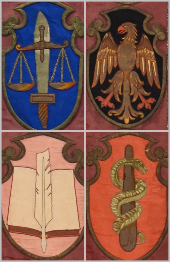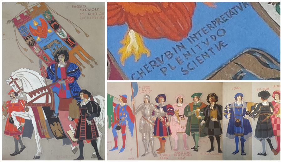 A Roma, il rettore Francesco Rocco, recepita la necessità imminente, in un mese e mezzo circa, riusciva a far progettare e commissionare sia il gonfalone che i costumi storici, a far partire la “macchina organizzativa” per il viaggio degli studenti e la spedizione degli apparati per il giorno dell’inaugurazione dei Giochi del 3 settembre 1933. Nell’agosto, la ditta romana Tanfani e Bertarelli, specializzata in ricami, paramenti sacri e sartoria, eseguiva il gonfalone in seta con ricami in filati metallici e per applicazione, frangiato d’oro. La lettera di commissione dell’Università, firmata dal prof. Nicola Spano per ordine del rettore, indicava di attenersi fedelmente al disegno del pittore prof. Giovanni Battista Conti (1878-1971), che avrebbe mantenuto la direzione artistica del lavoro anche durante l’esecuzione, e ne richiedeva la consegna nei termini improrogabili del 31 agosto, completo di asta, cordoni, fiocchi e altri accessori (spallacci in cuoio, astucci etc.). In realtà, come si nota nella foto del bozzetto firmato dal Conti, tre stemmi sono diversi. Nel gonfalone furono ricamati quelli della scuola di Geografia, Farmacia e Statistica anzichè quelli di Ingegneria, Scienze Economiche e commerciali e Architettura.