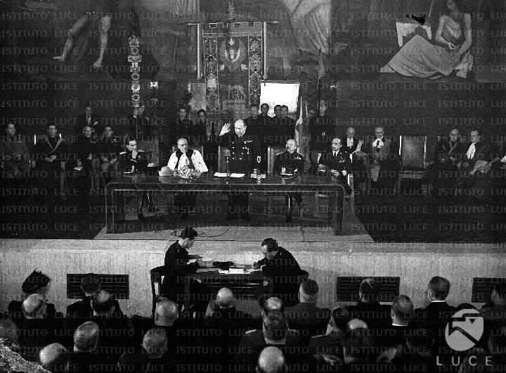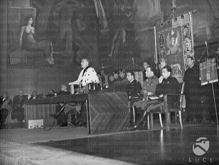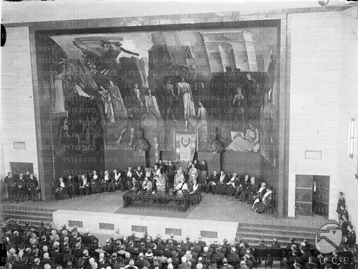Il 18 novembre, a Roma, giorno dell’inaugurazione dell'Anno Accademico 1933-34, tra professori in toga, alte personalità e studenti, il corteo storico sfila con il gonfalone nel cortile della sede di Sant’Ivo alla Sapienza. In quella occasione, l’insegna universitaria riceverà il suo “battesimo” e avrà come madrina la principessa Maria di Savoia[8]. Il gonfalone è testimone, negli anni a seguire delle manifestazioni ufficiali di inaugurazione degli anni accademici e, molto probabilmente per l’ultima volta, nell’ottobre del 1941 alla consegna della laurea in Economia honoris causa al ministro tedesco Funk.