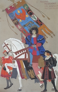 Il gonfalone fu commissionato ed eseguito nell’agosto del 1933 affinchè potesse sventolare in rappresentanza della Università di Roma ai Giochi universitari internazionali di Torino, previsti per il settembre di quell’anno, nello stadio Mussolini. Il programma dei Giochi avrebbe previsto la partecipazione di numerose università straniere e, pertanto, l’allora ministro dell’Educazione Nazionale, Francesco Ercole, disponeva che, “per rendere più solenne la cerimonia del giuramento”, fossero “presenti i gonfaloni degli Atenei d’Italia scortati dalla gioventù universitaria italiana, inquadrata nei Gruppi Universitari Fascisti”[1]. Achille Starace, segretario del PNF e dei GUF, in una circolare del 7 luglio, comunicava ai G.U.F.[2] d’Italia, il programma dettagliato per il giorno dell’inaugurazione dei Giochi che avrebbe visto sfilare le rappresentanze degli atenei in un corteo storico, ognuna delle quali formata da un tamburino, quattro trombettieri con drappelle, due alfieri con bandiere dei colori della città, due uomini d’arme, il paggio maggiore con il gonfalone della Università, fiancheggiato da due valletti e a chiusura un numero variabile di paggi[3].