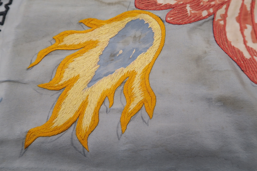 Il gonfalone fu confezionato in tessuto di seta (taffetas[1] effetto gros[2]) nei colori “governatoriali”, oro e amaranto, della città di Roma. Il riquadro centrale è in seta blu e reca l’immagine del cherubino con tre fiammelle in ricamo diretto punto raso (punto piatto[3]) in filato di seta policroma e, in parte, per applicazione[4] (zone centrali delle ali); l’iscrizione CHERUBIM INTERPRETATUR PLENITUDO SCIENTIÆ ricamata in canutiglia dorata[5]su imbottitura; la lupa capitolina con i gemelli su un basamento, eseguita in parte a ricamo diretto e in parte per applicazione. Si nota oggi, poichè il colore azzurro intenso della seta del riquadro centrale è fortemente desaturato, il disegno preparatorio per i ricami diretti che è eseguito a matita (particolare in foto 1). Dalle immagini al Dino Lite 60X e dalle analisi effettuate, l'originale seta bianca del basamento della lupa aveva un supporto in carta adesa con colla.