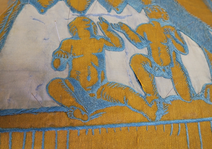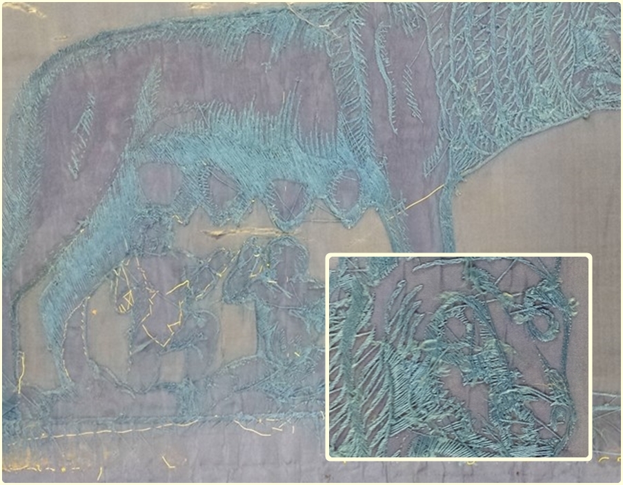 [4] Ricamo per applicazione: il motivo decorativo è creato mediante applicazione di una porzione sagomata di tessuto su quello di fondo, fissata perimetralmente, e talvolta anche al suo interno, con punti di ricamo diretto. L’applicazione ricamata invece, è una porzione di tessuto ricamata con vari soggetti e che viene poi applicata sul tessuto di fondo (tecnica utilizzata per gli stemmi delle facoltà).