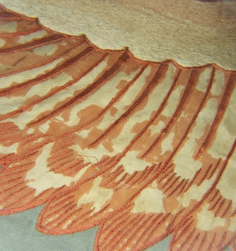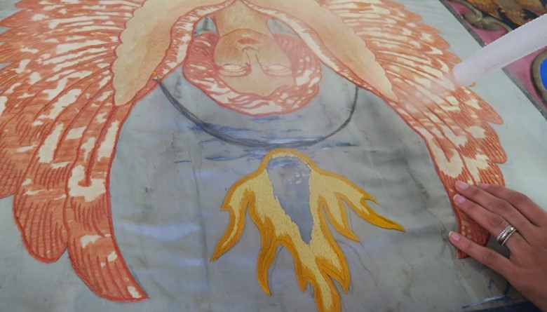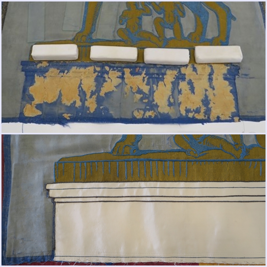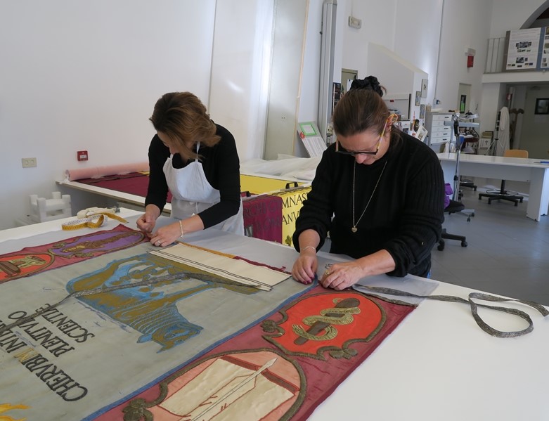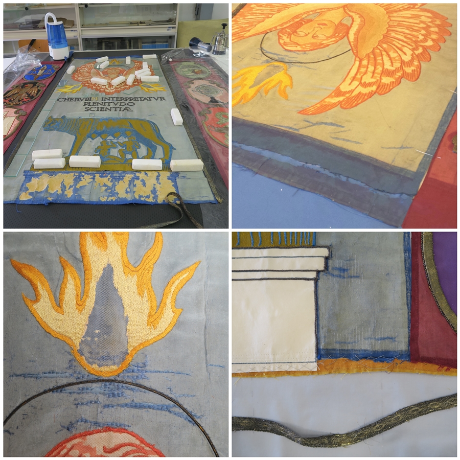 Il restauro ha interessato unicamente le zone originali del manufatto la cui seta, di supporto ai ricami, appariva piuttosto infragilita e lacerata. L’iniziale progetto di un intervento da compiere senza scucire il riquadro centrale dalle fasce laterali e dalla fodera dell’ultimo intervento, è stato abbandonato dopo l’attenta osservazione delle cuciture del confezionamento, che, lungo i galloni tra i teli e lungo il perimetro degli stemmi, si erano rivelate non originali e piuttosto non curate. In più, lo stato conservativo mediocre (gore dovute a percolature di acqua, offuscamento superficiale da particellato, lacerazioni diffuse) indirizzava verso la pulitura ad umido. Dopo le consuete operazioni di documentazione, indagini scientifiche[1] e test, è stato possibile procedere alla pulitura della superficie contemporaneamente allo smontaggio del riquadro centrale e delle fasce verticali sia dalla fodera interna che dal tessuto nuovo dell’intervento più recente, totalmente eseguito con cuciture a macchina che creavano anche lievi tensioni. La pulitura è stata compiuta per mezzo di aspirazione, vaporizzazione con apparecchio ad ultrasuoni e infine con l’intervento ad umido su tavolo aspirante, utilizzando piccole spugne in lattice permettendo così la rimozione delle gore e del particellato, e la carta assorbente per far depositare le sostanze solubilizzate e favorire una iniziale asciugatura. La seta ancora umida è stata quindi posizionata correttamente secondo l’ortogonalità orditi/trame avendo cura di risanare le deformazioni anche createsi nelle zone attigue alle lacerazioni. L’intervento di restauro a cucito a “punto posato”, con filati in seta e aghi chirurgici, ha ricomposto tutte le lacerazioni e le zone con trame svincolate dalla rottura degli orditi. Ha consolidato anche alcune parti del ricamo (soprattutto nelle ali del cherubino) che sono state poi protette con tulle di colore intonato. La fodera interna, composta da più parti cucite tra loro, molto deformata, era stata resecata durante l’intervento più recente, così da non essere di rinforzo nella parte superiore ed inferiore. Potenzialmente dannosa, con residui di adesivi e macchie evidenti, non assolvendo più la sua funzione strutturale è stata rimossa preferendone la sostituzione con una nuova (costituita dall’accoppiamento a cucito di due tessuti di cotone e di monofilo di poliestere). Pertanto si è ricomposta l’opera su un supporto funzionale formato accoppiando a cucito un tessuto di cotone/poliestere grigio-azzurro e un tessuto trasparente di poliestere. Il primo ha avuto la funzione di chiudere otticamente alcune piccole lacune nel consolidamento a punto posato delle zone lacerate; il secondo ha avuto il compito di garantire l’indeformabilità e la stabilità del nuovo sistema venutosi a creare. L’intervento si è concluso con l’applicazione a cucito del tessuto bicolore giallo-amaranto relativo al precedente intervento.