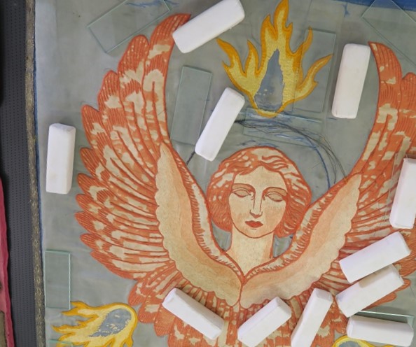 La rimozione del confezionamento ha permesso di osservare sia la tecnica di esecuzione dell’oggetto sia le successive modifiche al ricamo. I ricami eseguiti direttamente sulla seta azzurra si sono rivelati troppo pesanti e hanno rappresentato quindi la causa macroscopica dell’indebolimento e delle lacerazioni del tessuto. La fodera originale interna in lino cerato perciò non ha mai avuto funzione di supporto dei ricami ma quella di sostenere internamente la struttura del gonfalone attraverso le cuciture perimetrali e verticali (nascoste sotto i galloni) che la fissavano al recto e (molto verosimilmente) al verso oggi perduto. Sul rovescio del riquadro centrale erano visibili integrazioni e modifiche localizzate sul viso del cherubino e sulla M della scritta CHERUBIM. L’osservazione a 60 e 220 ingrandimenti (microscopio digitale Dino-lite) ha reso più evidente i fori lasciati dal passaggio di un ago per ricamare un’altra lettera (una N) e le analisi scientifiche hanno attestato l’uso di una identica tipologia di filati policromi per l’integrazione del ricamo e per il fissaggio della canutiglia utilizzata nella scritta. La M oggi appare ancora dorata, si differenzia dalle altre lettere perché sebbene sia identica per tipologia costruttiva non lo è nella composizione chimica. E’ a base di rame, il resto della canutiglia è in argento dorato[2]. Questa particolarità rende indubbio un intervento della stessa ditta produttrice, che utilizzava moltissime varietà di filati metallici piuttosto simili tra loro, cui si può riferire una modifica eseguita poco dopo l’esecuzione del manufatto.