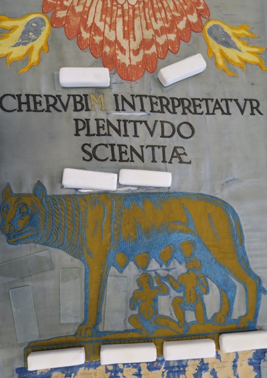 La tipologia dell’oggetto, il simbolo del cherubino e lo stile del gonfalone della Regia Università di Roma derivano da una riflessione espressa circa vent’anni prima da Domenico Gnoli[3], in un articolo del 1913[4]sul Giornale d’Italia, in cui poneva il problema della realizzazione grafica di un nuovo stemma o sigillo per la Regia Università e proponeva come fonte “l’opportunità di considerare l’insegnamento di san Tommaso”, per il quale la denominazione di cherubino significa pienezza di conoscenza o effusione di sapienza, “riportandone intorno al Cherubino, nuovo stemma dell’università, la citazione letteraria “Cherubin interpretatur plenitudo scientiae”[5]. E’ la parola CHERUBIN che compare nel bozzetto a colori[6], a firma del Conti che servì per la realizzazione del gonfalone. Dopo la cerimonia di inaugurazione dei Giochi[7]del settembre del 1933, i gonfaloni delle università furono esposti nella Mostra documentaria di Vita Goliardica in programma a Torino presso la Galleria “Il Faro”[8] fino alla metà del mese e solamente il 18 novembre[9], a Roma, nel giorno dell’inaugurazione dell'Anno Accademico 1933-34, il gonfalone sfilò con il corteo storico nel cortile della sede di Sant’Ivo alla Sapienza. Sul vessillo campeggiava, nell’iscrizione, la parola CHERUBIM. E’ logico pensare che nel lasso di tempo intercorso tra i giochi universitari e l’inaugurazione dell’anno accademico possa essere avvenuta la modifica al ricamo, dato che non riproponeva le parole esatte di san Tommaso D’Aquino[10], a carico della stessa ditta che fornì per l’occasione le toghe[11]. Una buona documentazione fotografica del settembre 1933 non si è rinvenuta finora... e avrebbe testimoniato ulteriormente la modifica della scritta. Neanche purtroppo si è rinvenuto nessun documento scritto che potesse indicare la persona che si accorse del "cherubin" errato! Il momento del restauro, ancora una volta, ci immerge nella storia delle opere oggetto di nostra cura e conservazione: si conferma come unico particolare attimo di analisi in cui possono svelarsi tutte le modifiche occorse se riusciamo anche ad avere l’opportunità di “leggerle” con l’ausilio della ricerca storica e d’archivio.